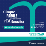 Il webinar propone un percorso attraverso cinque parole chiave per raccontare le caratteristiche dell’Intelligenza Artificiale (IA) Generativa, invitando ad accoglierla per ciò che è: una possibilità, non priva di rischi, per l’interrogazione, l’immaginazione e la costruzione di nuovi significati. L’incontro rappresenta inoltre l’occasione per esplorare le più recenti novità della documentazione istituzionale in materia e presentare i due Speciali Treccani Scuola dedicati al tema.